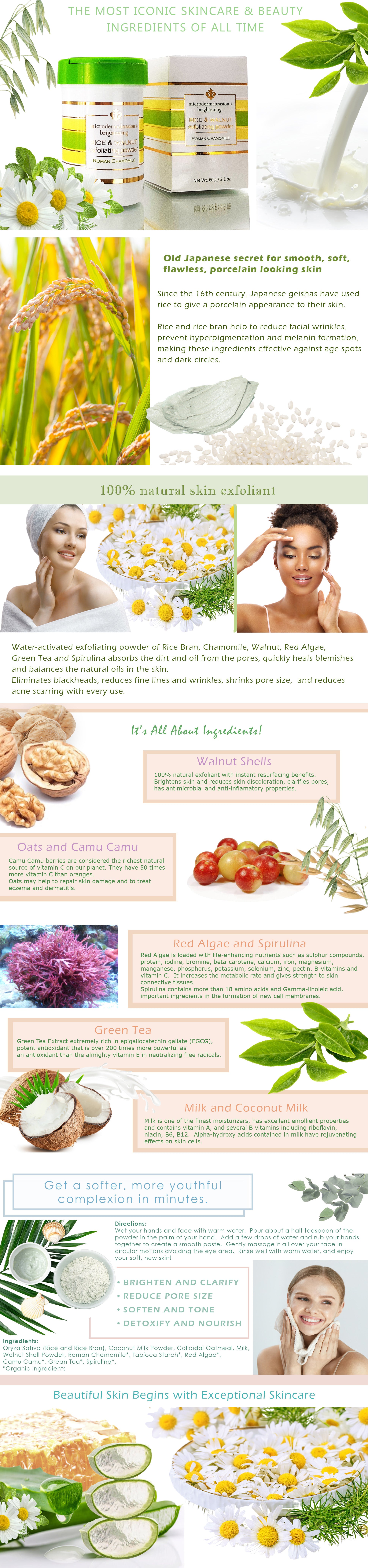 - Water-activated exfoliating powder of Rice Bran, Walnut Shell, Chamomile, Red Algae, Green Tea, Camu Camu and Spirulina absorbs the dirt and oil from the pores, quickly heals blemishes and balances the natural oils in the skin.